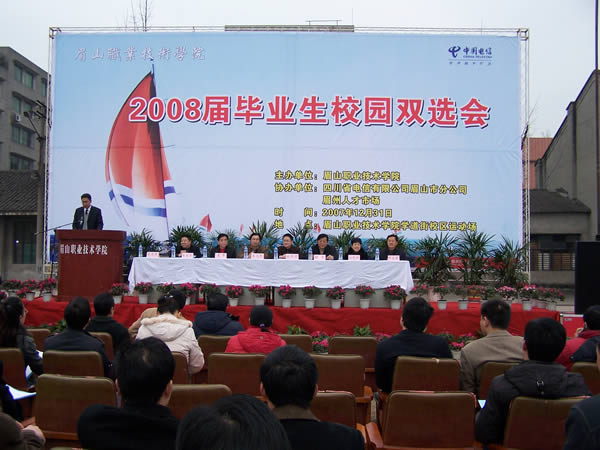2007年12月31日上午10時(shí),眉州人才市場與眉山職業(yè)技術(shù)學(xué)院聯(lián)合舉辦的“2008屆畢業(yè)生雙選會(huì)”隆重開幕,此次盛會(huì)是眉州人才市場與眉山職業(yè)技術(shù)學(xué)院為解決應(yīng)屆畢業(yè)生就業(yè)的重大舉措,推進(jìn)了該校畢業(yè)生就業(yè)工作,促進(jìn)畢業(yè)生充分就業(yè),為用人單位和畢業(yè)生提供一個(gè)雙向選擇的平臺(tái),此次盛會(huì)有近150家招聘單位蒞臨招聘,2000余名求職者到會(huì)求職。